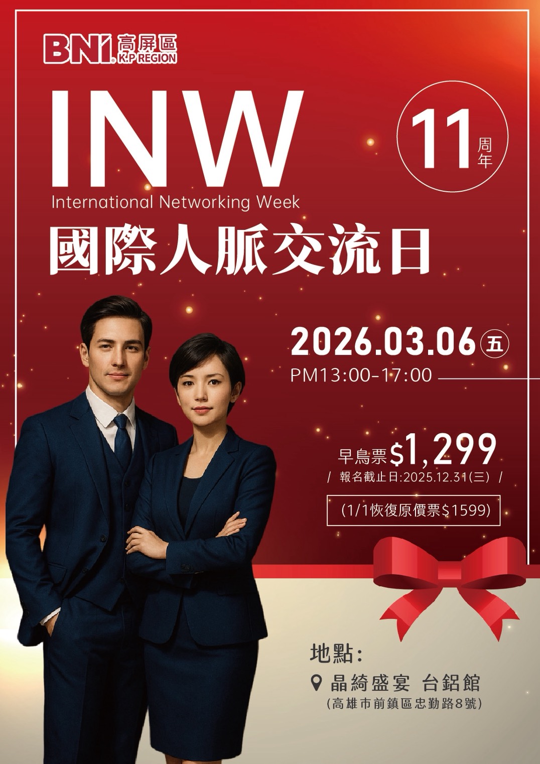 INW (lnternational Networking week) 國際人脈交流週,目的是讓商務人士知道,人脈在於生意成功或商務的成長,都扮演了非常重要的角色,