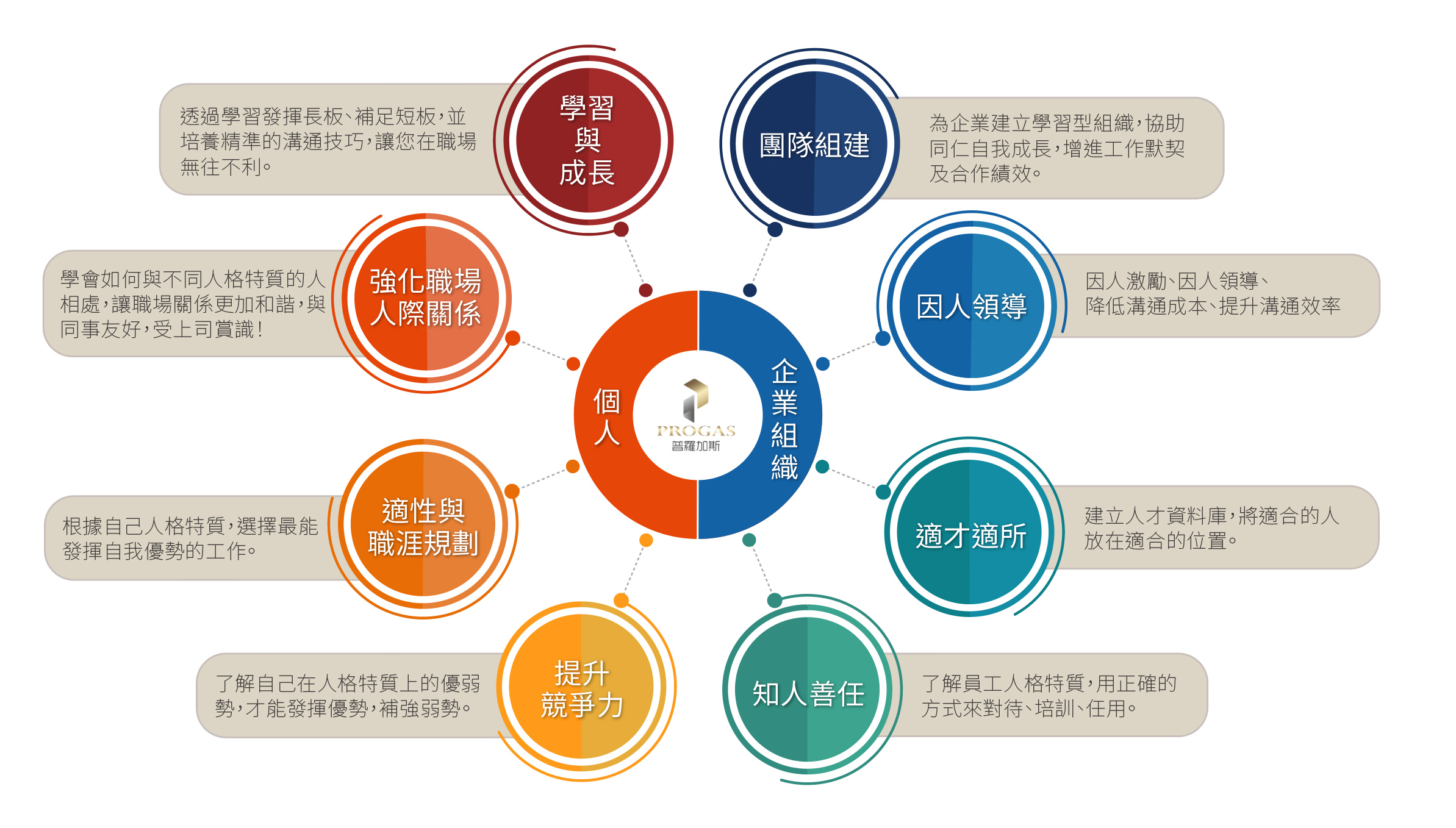 普羅加斯將發展已久的歐美測評系統予以迭代更新,更重要的是加以漢化,成為最新、最精準、最適合華人使用的人格特質測評工具。